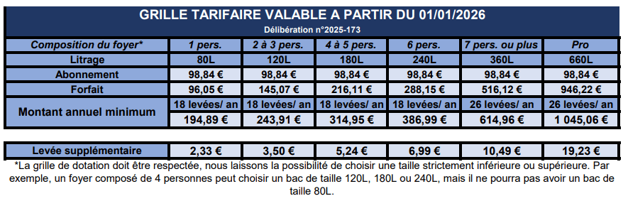 GRILLE TARIFAIRE 2026 POUR LES PARTICULIERS ET PROFESSIONNELS NON GROS PRODUCTEURS DE DÉCHETS