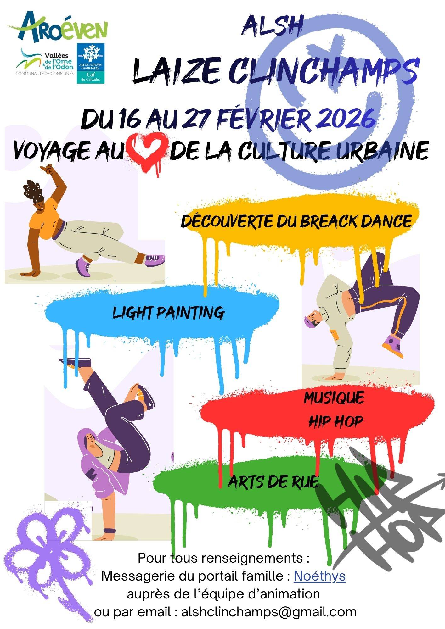 Du 16 au 27 février 2026, l’Accueil de Loisirs de Laize-Clinchamps invite les enfants à vivre une expérience originale et créative autour de la culture urbaine. Porté par l’équipe de l’ALSH Vivaldi et Les 4 Saisons, ce programme propose un véritable voyage artistique mêlant break dance, light painting, musique hip-hop et arts de rue.